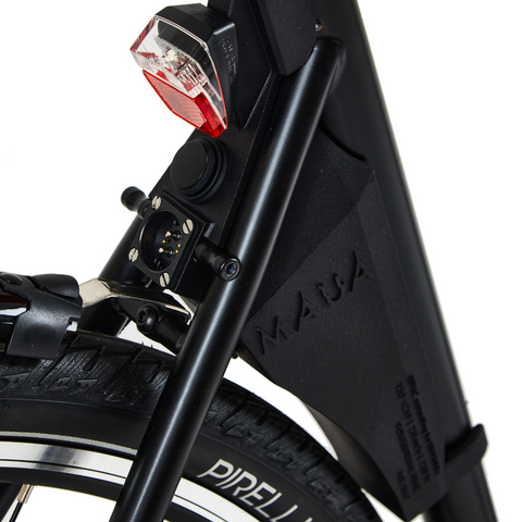 The battery pack, designed by Maua, is integrated into the three tubes of the frame and is made up of 24 lithium iron phosphate cells, which guarantee a significantly longer useful life than the battery packs of common e-bikes.